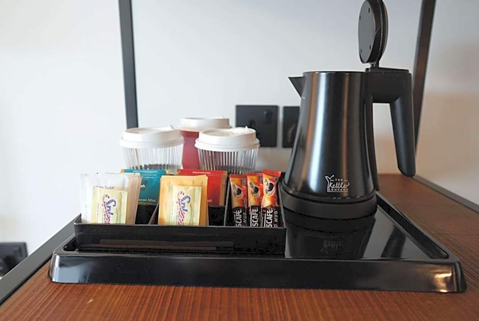 This family room has a electric kettle, soundproofing and tea/coffee maker.